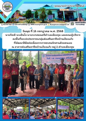 นายกเทศมนตรีตำบลเมืองชุม และคณะผู้บริหาร ลงพื้นที่พบปะประชาชนกลุ่มส่งเสริมอาชีพบ้านเวียงแก้ว ที่พัฒนาฝีมือต่อเนื่องจากการอบรมจักสานด้วยตนเอง ณ อาคารส่งเสริมอาชีพบ้านเวียงแก้ว หมู่ 2 ตำบลเมืองชุม