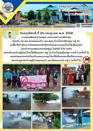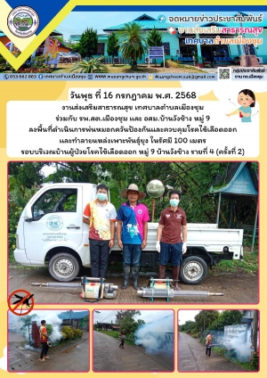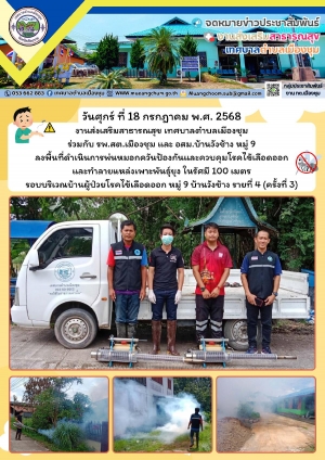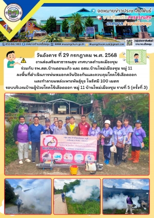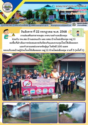 ลงพื้นที่ดำเนินการพ่นหมอกควันป้องกันและควบคุมโรคไข้เลือดออก และทำลายแหล่งเพาะพันธุ์ยุง ในรัศมี 100 เมตร รอบบริเวณบ้านผู้ป่วยฯ หมู่ 11 รายที่ 3 (ครั้งที่ 3)และพ่นหมอกควันฯ ทั่วทั้งหมู่บ้านใหม่เมืองชุม