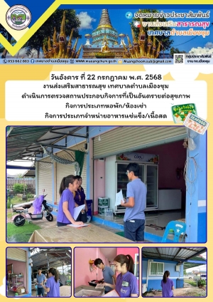 งานส่งเสริมสาธารณสุข เทศบาลตำบลเมืองชุม ดำเนินการตรวจสถานประกอบกิจการที่เป็นอันตรายต่อสุขภาพ กิจการประเภทหอพัก/ห้องเช่า กิจการประเภทจำหน่ายอาหารแช่แข็ง/เนื้อสด