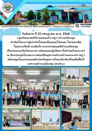 โครงการรู้เท่าทันโรคมะเร็งถุงลมโป่งพอง โรคหอบหืด ดำเนินโครงการฯ โดย กลุ่มพัฒนาสตรีบ้านดอนแก้ว หมู่ 1 สนับสนุนโดยกองทุนหลักประกันสุขภาพในระดับท้องถิ่นหรือพื้นที่เทศบาลตำบลเมืองชุม (สปสช.)