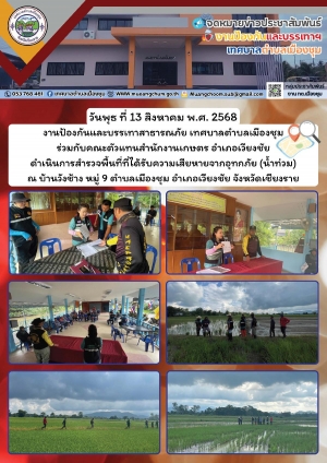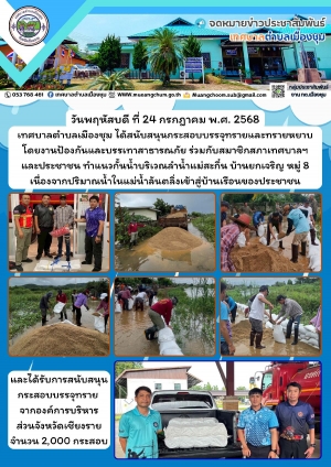นายกเทศมนตรีตำบลเมืองชุม พร้อมด้วยคณะผู้บริหาร และสมาชิกสภาเทศบาลฯ ลงพื้นที่ตรวจสอบสถานการณ์พื้นที่เสี่ยงภัยน้ำท่วมบ้านดอนมูล หมู่ 10 และสนับสนุนกระสอบบรรจุทรายและทรายหยาบสำหรับทำแนวกั้นน้ำ