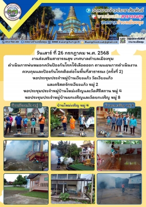 ลงพื้นที่ดำเนินการพ่นหมอกควันป้องกันฯ และทำลายแหล่งเพาะพันธุ์ยุง ในรัศมี 100 เมตร รอบบริเวณบ้านผู้ป่วยโรคไข้เลือดออก หมู่ 11 บ้านใหม่เมืองชุม รายที่ 5 (ครั้งที่ 2) และหอประชุม หมู่ 1 และวัดดอนแก้ว หมู