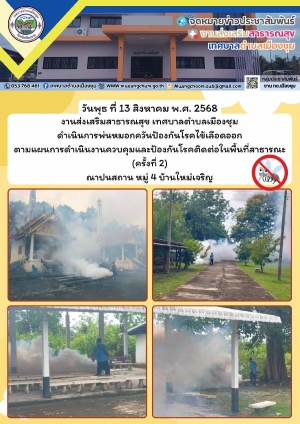 งานส่งเสริมสาธารณสุข เทศบาลตำบลเมืองชุม ดำเนินการพ่นหมอกควันป้องกันโรคไข้เลือดออก ตามแผนการดำเนินงานควบคุมและป้องกันโรคติดต่อในพื้นที่สาธารณะ (ครั้งที่ 2) ณาปนสถาน หมู่ 4 บ้านใหม่เจริญ