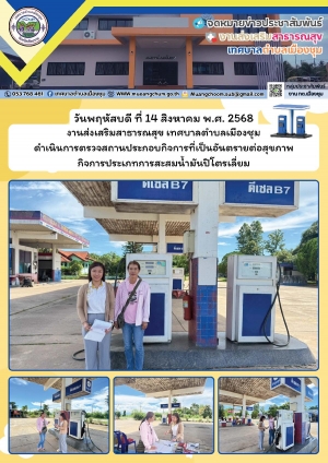 งานส่งเสริมสาธารณสุข เทศบาลตำบลเมืองชุม ดำเนินการตรวจสถานประกอบกิจการที่เป็นอันตรายต่อสุขภาพ กิจการประเภทการสะสมน้ำมันปิโตรเลี่ยม