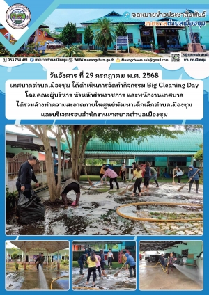กิจกรรม Big Cleaning Day โดยคณะผู้บริหาร หัวหน้าส่วนราชการ และพนักงานเทศบาล ได้ร่วมล้างทำความสะอาดภายในศูนย์พัฒนาเด็กเล็กตำบลเมืองชุม และบริเวณรอบสำนักงานเทศบาลตำบลเมืองชุม