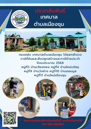 งานจัดเก็บและพัฒนารายได้ กองคลัง เทศบาลตำบลเมืองชุม ได้ออกสำรวจ ภาษีป้าย ภาษีที่ดินและสิ่งปลูกสร้าง ของผู้ประกอบกิจการในเขตพื้นที่ตำบลเมืองชุม เพื่อประเมินภาษีประจำปี พ.ศ.2568