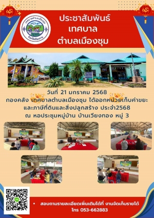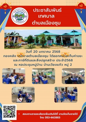 กองคลัง เทศบาลตำบลเมืองชุม ได้ออกหน่วยเก็บค่าขยะและภาษีที่ดินและสิ่งปลูกสร้าง ประจำ2568 ณ หอประชุมหมู่บ้าน บ้านเวียงแก้ว หมู่ 2
