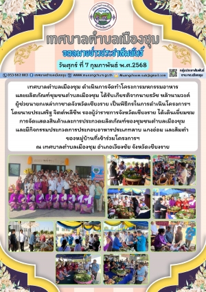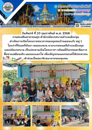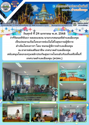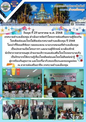 โครงการส่งเสริมความรู้ป้องกันโรคติดต่อและโรคไม่ติดต่อเทศบาลตำบลเมืองชุม ปี 2568 ให้ความรู้เรื่องโรคติดต่อและโรคไม่ติดต่อน่ารู้สู่การป้องกันสุขภาพ และโรคที่มากับขยะเปียกและขยะมูลฝอย ณ อาคารส่งเสริมอาชี