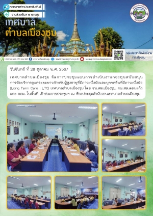 ประชุมแผนการดำเนินงานกองทุนสนับสนุนการจัดบริการดูแลระยะยาวสำหรับผู้สูงอายุที่มีภาวะพึ่งพิงและบุคคลอื่นที่มีภาวะพึ่งพิง (Long Term Care : LTC) เทศบาลตำบลเมืองชุม