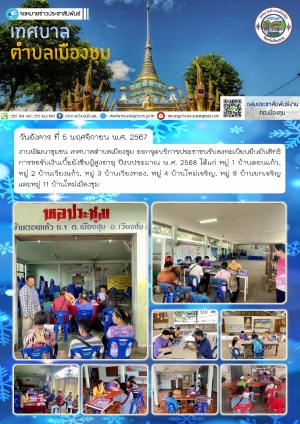 งานพัฒนาชุมชน เทศบาลตำบลเมืองชุม ออกจุดบริการประชาชนรับลงทะเบียนยืนยันสิทธิการขอรับเงินเบี้ยยังชีพผู้สูงอายุ ปีงบประมาณ พ.ศ. 2568 ได้แก่ ม.1 / ม.2 / ม.3 / ม.4 / ม.8 / ม.11