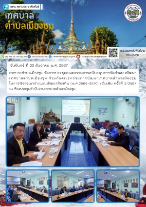 ประชุมคณะกรรมการสนับสนุนการจัดทำแผนพัฒนาเทศบาลตำบลเมืองชุม ร่วมกับคณะกรรมการพัฒนาเทศบาลตำบลเมืองชุม ในการพิจารณาร่างแผนพัฒนาท้องถิ่น (พ.ศ.2566-2570) เพิ่มเติม ครั้งที่ 3/2567