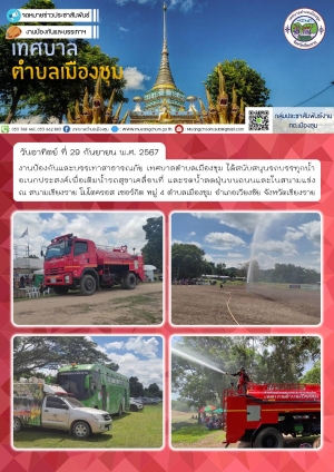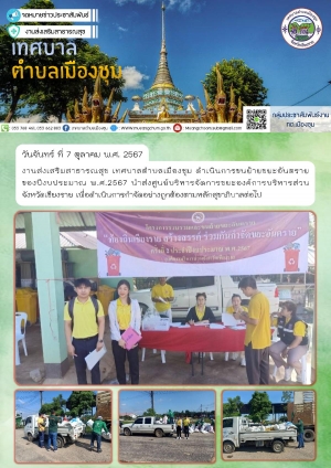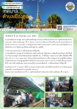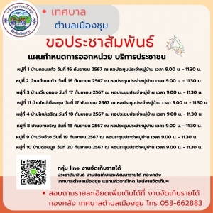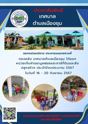 กองคลัง เทศบาลตำบลเมืองชุมได้ออกหน่วยบริการประชาชนนอกสถานที่ เก็บค่าขยะมูลฝอย,ภาษีที่ดินและสิ่งปลูกสร้าง ในวันที16-20 กันยายน (ประจำปีงบประมาณ 2567)