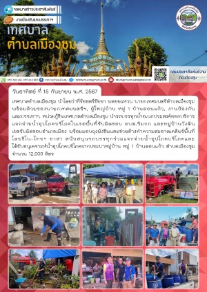 เทศบาลตำบลเมืองชุม แจกจ่ายน้ำอุปโภคบริโภคในเขตพื้นที่รับผิดชอบ อบต.ริมกก ได้รับอนุเคราะห์จากประปาหมู่บ้าน หมู่ 1 บ้านดอนแก้ว ตำบลเมืองชุม จำนวน 6,000 ลิตร