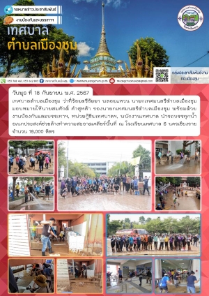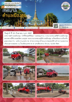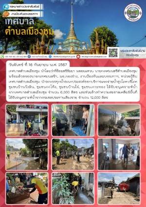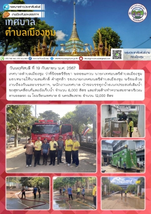 เทศบาลตำบลเมืองชุม แจกจ่ายน้ำอุปโภคบริโภค ชุมชนบ้านวังดิน, ชุมชนกกโท้ง, ชุมชนบ้านไร่, ชุมชนเกาะทอง จำนวน 6,000 ลิตร และช่วยล้างทำความสะอาดเคลียร์พื้นที่ จำนวน 12,000 ลิตร