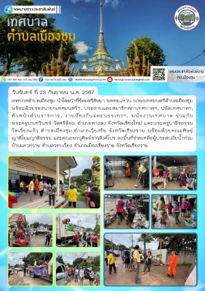 เทศบาลตำบลเมืองชุม ร่วมกับพระครูบาเทวินทร์ วัดศรีล้อม และพระครูบาธีรธรรม วัดเวียงแก้ว พร้อมด้วยคณะศิษย์ญาติโยมญาติธรรมลงพื้นที่ช่วยเหลือผู้ประสบภัยน้ำท่วม บ้านแควหวาย จังหวัดเชียงราย