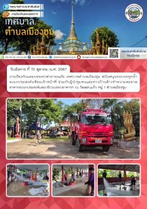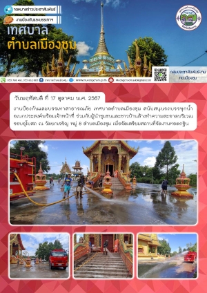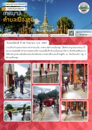สนับสนุนรถบรรทุกน้ำอเนกประสงค์พร้อมเจ้าหน้าที่ ร่วมกับผู้นำชุมชนและชาวบ้านล้างทำความสะอาดบริเวณรอบอุโบสถ ณ วัดยกเจริญ หมู่ 8 ตำบลเมืองชุม เพื่อจัดเตรียมสถานที่จัดงานทอดกฐิน