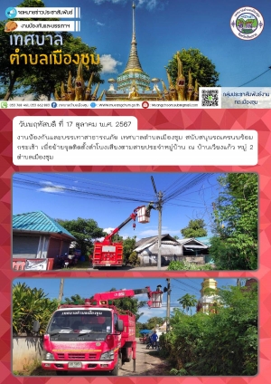 งานป้องกันและบรรเทาสาธารณภัย เทศบาลตำบลเมืองชุม ได้สนับสนุนรถเครนพร้อมกระเช้า เพื่อดำเนินการตัดกิ่งต้นไม้ ณ วัดวังช้าง หมู่ 9 บ้านวังช้าง ตำบลเมืองชุม