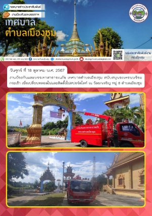 สนับสนุนรถเครนพร้อมกระเช้า เพื่อเปลี่ยนหลอดไฟและติดตั้งไฟสปอร์ตไลท์ ณ วัดยกเจริญ หมู่ 8 ตำบลเมืองชุม