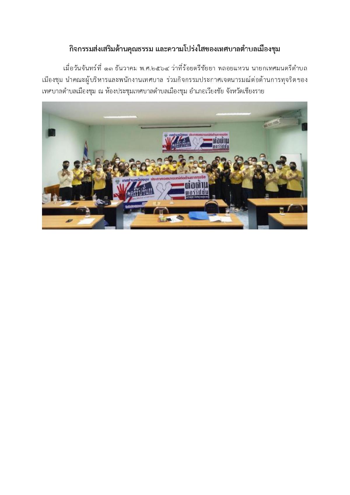 เมื่อวันที่ 13 ธันวาคม 2564 ว่าที่ร้อยตรีชัยยา พลอยแหวน นายกเทศมนตรีตำบลเมืองชุม นำคณะผู้บริหารและพนักงานเทศบาล ร่วมกิจกรรมประกาศเจตนารมณ์ต่อต้านการทุจริตของเทศบาลตำบลเมืองชุม ณ ห้องประชุมเทศบาลตำบลเมืองชุม
