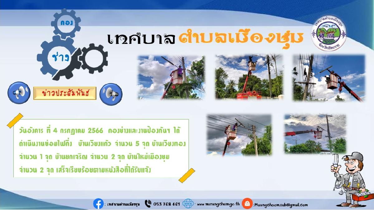 วันอังคารที่ 4 กรกฎาคม 2566 กองช่างและงานป้องกันได้ดำเนินการซ่อมแซมไฟกิ่ง บ้านเวียงแก้ว จำนวน 5 จุด บ้านเวียงทอง จำนวน 1 จุด บ้านยกเจริญ จำนวน 2 จุด บ้านใหม่เมืองชุม จำนวน 2 จุดเสร็จเรียบร้อยตามหนัสือที่ได้รับแจ้ง