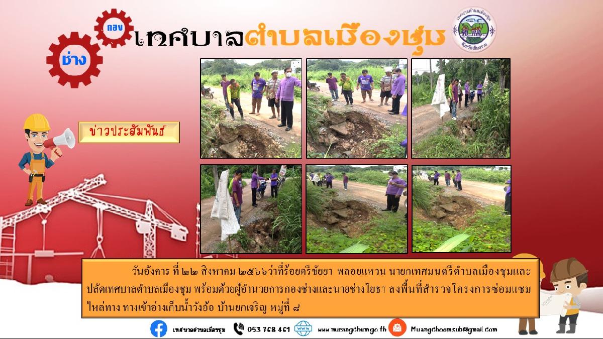 วันอังคาร ที่ 22 สิงหาคม 2566 ว่าที่ร้อยตรีชัยยา พลอยแหวน นายกเทศมนตรีตำบลเมืองชุมและปลัดเทศบาล พร้อมด้วยผู้อำนวยการกองช่าง นายช่างโยธา สมาชิกสภาเทศบาลและประชาชนในหมู่บ้าน ลงพื้นที่สำรวจโครงก่อสร้างขยายไหล่ทางถนนวังอ้อ ซอย 10 บ้านยกเจริญ หมู่ที่ 8 ตำบลเมืองชุม อำเภอเวียงชัย จังหวัดเชียงราย ที่เกิดการทรุดตัวลงของถนน ทางกองช่างจึงไปตรวจสอบและจะทำการแก้ไขถนนที่เกิดการทรุดตัวทรงเพื่อการจราจรให้กับประชาชนในพื้นที่และความปลอดภัยในชีวิตและทรัพย์สินของประชาชนในพื้นที่ที่ใช้เส้นทางดังกล่าว