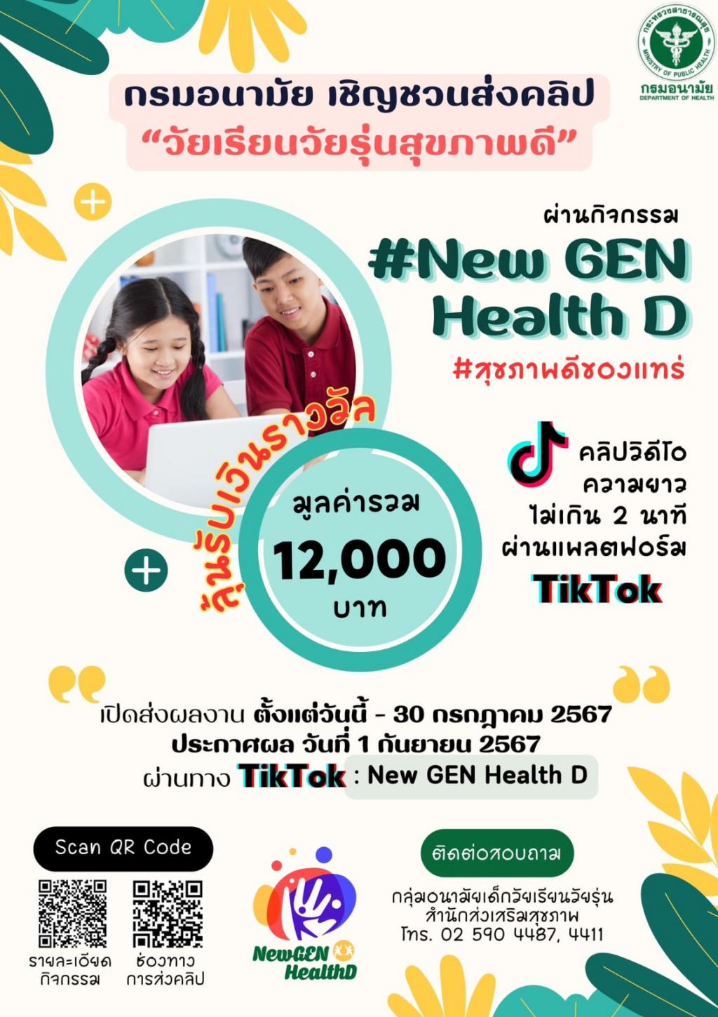ด้วยกรมอนามัยให้ความสำคัญกับการเสริมสร้างความรอบรู้ด้านสุขภาพ (Health literacy) ในเด็กวัยเรียนวัยรุ่นควบคู่กับการรู้เท่าทันดิจิทัล (Digital literacy) จึงได้จัดกิจกรรมประกวด Tik Tok Challenge "New Gen Health D" เพื่อสนับสนุนเด็กวัยเรียนวัยรุ่นในการเป็นแกนนำด้านสุขภาพ สามารถเข้าถึงข้อมูลด้านสุขภาพที่ถูกต้อง เป็นผู้สร้างสื่อดิจิทัล และส่งต่อข้อมูลสุขภาพที่ถูกต้องไปยังครอบครัว เพื่อน และคนรอบข้างได้ตลอดจนสร้างกระแสการส่งเสริมสุขภาพเด็กวัยเรียนวัยรุ่นผ่านแพลตฟอร์มออนไลน์ในการนี้ จึงขอประชาสัมพันธ์เชิญชวนให้โรงเรียนในสังกัดเข้าร่วมกิจกรรม Tik Tok Challenge "New Gen Health D"