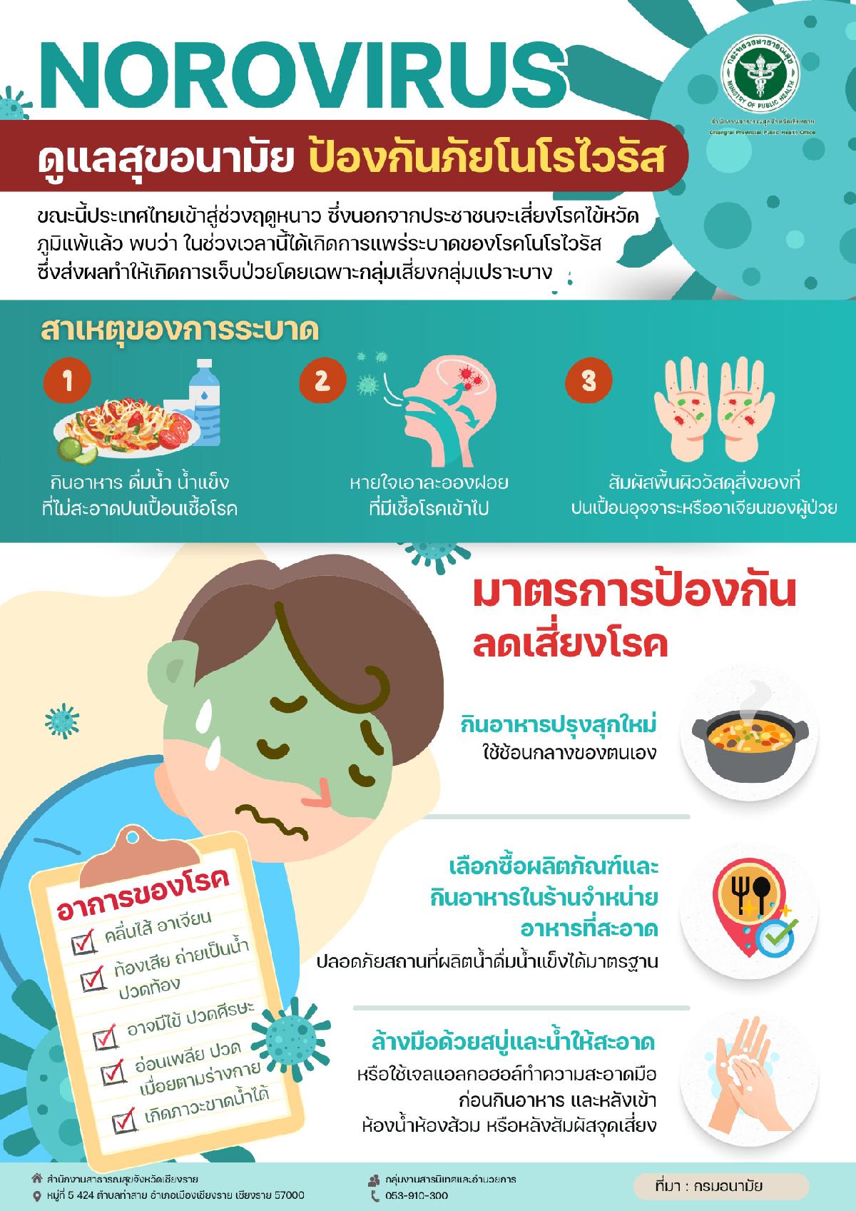ขณะนี้ประเทศไทยเข้าสู่ช่วงฤดูหนาว ซึ่งนอกจากประชาชนจะเสี่ยงโรคไข้หวัด ภูมิแพ้ ยังพบว่าในช่วงนี้ได้เกิดการแพร่ระบาดของโรคโนโรไวรัส ซึ่งส่งผลทำให้เกิดการเจ็บป่วยดดยเฉพาะกลุ่มเสี่ยง กลุ่มเปราะบาง