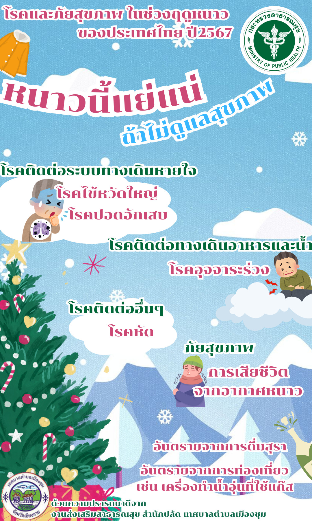 ขณะนี้ประเทศไทยเข้าสู่ฤดูหนาว ทำให้สภาพอากาศมีการเปลี่ยนแปลง บางพื้นที่อาจมีอากาศหนาวเย็นจัด อุณหภูมิลดต่ำลงอย่างต่อเนื่อง รวมถึงพื้นที่ภูเขาสูงและป่าไม้ล้อมรอบ ซึ่งเป็นสถานที่ท่องเที่ยวที่ได้รับความนิยมในช่วงวันหยุดอาจส่งผลกับสุขภาพและเพิ่มแนวโน้มความเจ็บป่วยด้วยโรคและภัยสุขภาพในช่วงฤดูหนาว